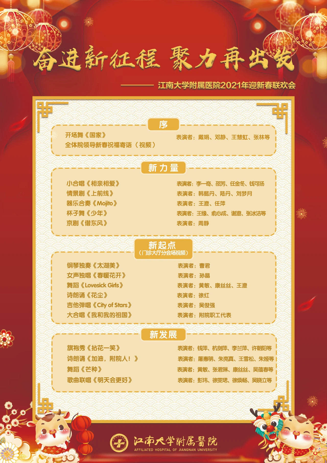 别样的形式,熟悉的身影,附院人的联欢会节目依然热情澎湃,歌舞表演、器乐合奏、诗朗诵、情景剧等等,还有全体领导新春送祝福,都是您不容错过的视觉盛宴!