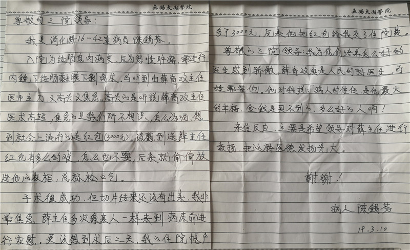 “遇到你是我们病人的幸运”——致消化内科薛育政及胃肠内外科鲍传庆主任的感谢信