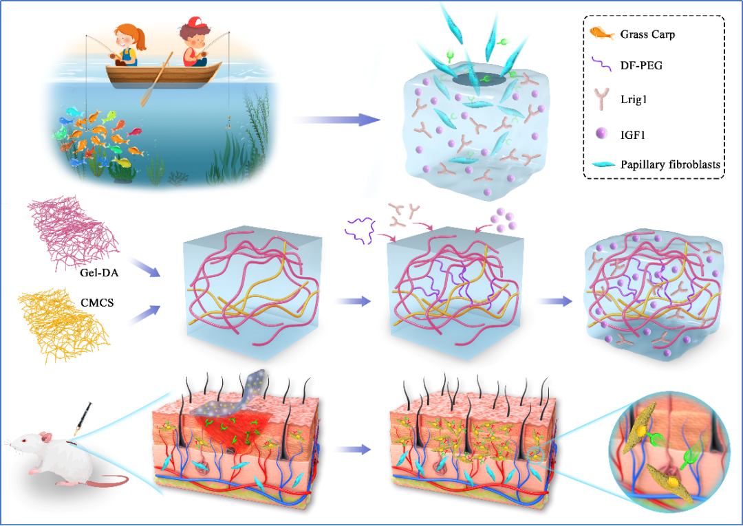 近日袁凤来课题组与江南大学化工学院张洪吉教授合作研究的可招募Lrig1+乳头成纤维细胞促伤口再生多功能水凝胶在中科院1区杂志Nano Research发表。研究发现,乳头状成纤维细胞参与毛囊的形成。其中,Lrig1+乳头状成纤维细胞表达于真皮层上部,具有促皮肤愈合及再生能力。因此,在伤口愈合过程中,迫切需要开发一种选择性的策略将Lrig1+乳头状成纤维细胞募集到伤口部位,促功能性愈合。该研究开发一种可注射自愈性的多功能天然水凝胶,负载Lrig1抗体和IGF1,可协同促进Lrig1+成纤维细胞的募集,促进创面再生性愈合。因此,设计可注射的自愈合多功能PDC@Lrig1@IGF1水凝胶来招募Lrig1+乳头状成纤维细胞的可以为伤口实现功能化愈合提供新的思路。