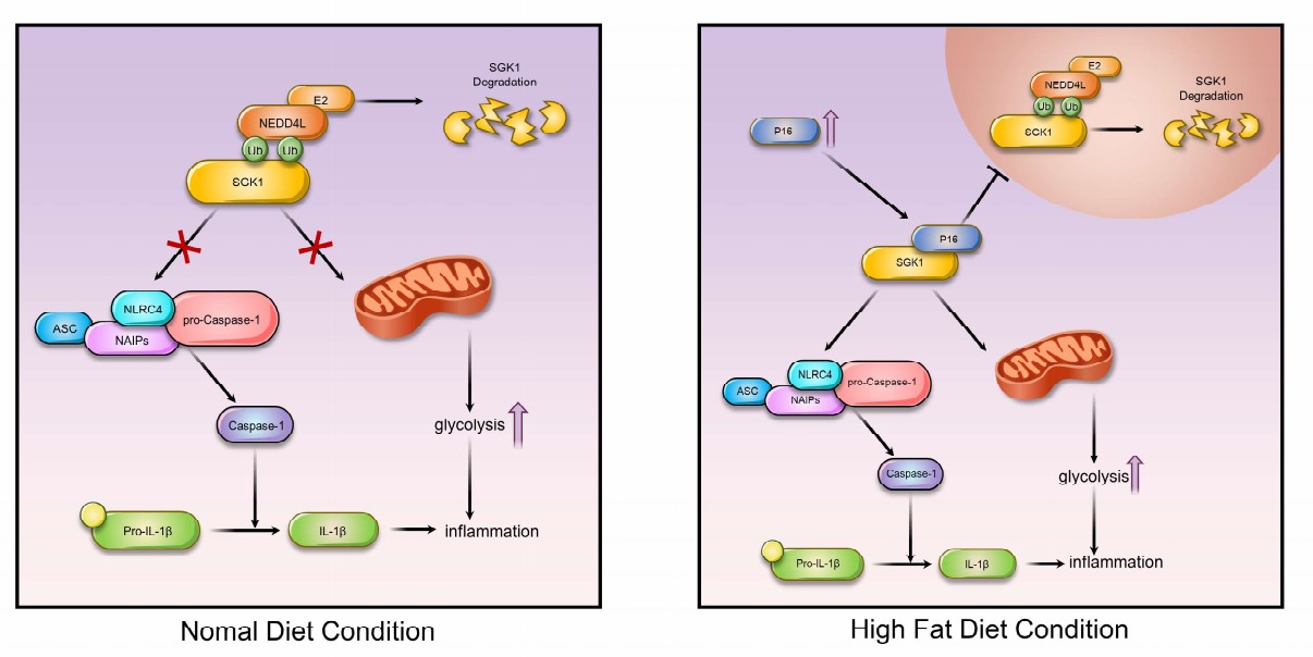 心内科王晓彦/顾鑫团队与南京医科大学靳建亮教授、杜颖强、孟浩宇副教授等人联合发现了p16阳性衰老细胞在高脂饮食小鼠心肺衰老相关纤维化(SAF)中的新作用,部分结果已发表在Clinical and Translational Medicine杂志。王晓彦/顾鑫等人揭示了p16竞争结合SGK1,抑制NEDD4L-Ubc5泛素复合体介导SGK1泛素化降解,SGK1通过重塑衰老细胞“氧化磷酸化-糖酵解”代谢模式加剧炎性衰老相关纤维化改变。小分子药物EMD638683可逆转这一病理过程。该研究报道了p16调控NEDD4L-Ubc5泛素复合体及SGK1之间的新机制并筛选了特异性E2泛素连接酶,为防治衰老相关疾病提供了新的靶点。