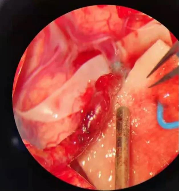 最终在江大附院一体化复合手术室,吴卫江和神经外科介入医生刘晓勇共同配合,打开一个仅有4厘米的骨窗,找到与颅外血管匹配的健康血管,通过造影定位血流供应区域,借助显微镜,吴主任开始端侧吻合,在1.5毫米的吻合口处缝了15针,两根血管成功相接,血流状况良好。