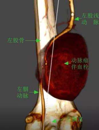 卢阿姨也是多学科联合治疗的受益者。两月前,她的左膝内上方出现一肿块,持续疼痛。经检查发现其左膝外侧有一鸡蛋大小的肿块,触之搏动感明显,用可闻及血管杂音,下肢动脉CTA考虑为“左股浅动脉瘤伴血栓形成”。该血管瘤像是一颗定时炸弹,若不及时手术消除极易造成两种可能:一是血栓脱落,引起肢体远端坏死截肢;二是血管瘤破裂大出血,导致休克乃至于死亡。
