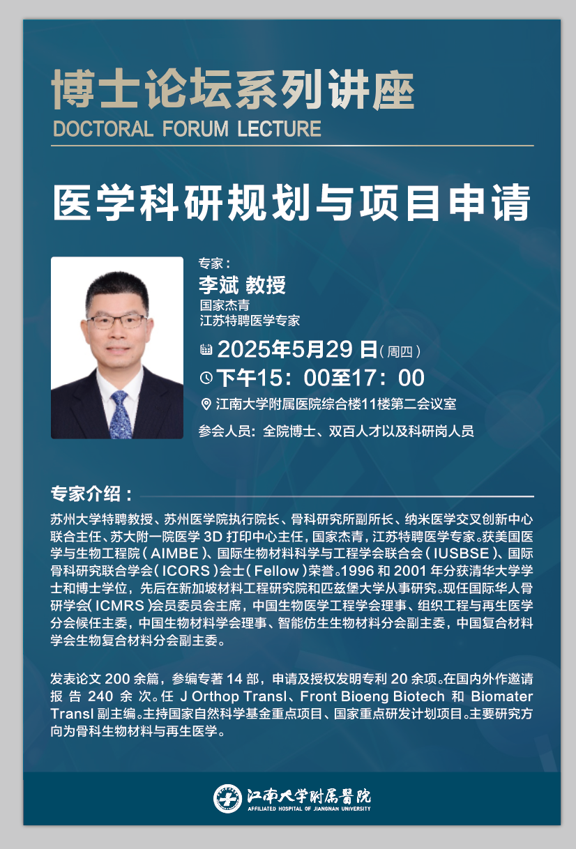 学术讲座 | 医学科研规划与项目申请——苏州大学李斌教授